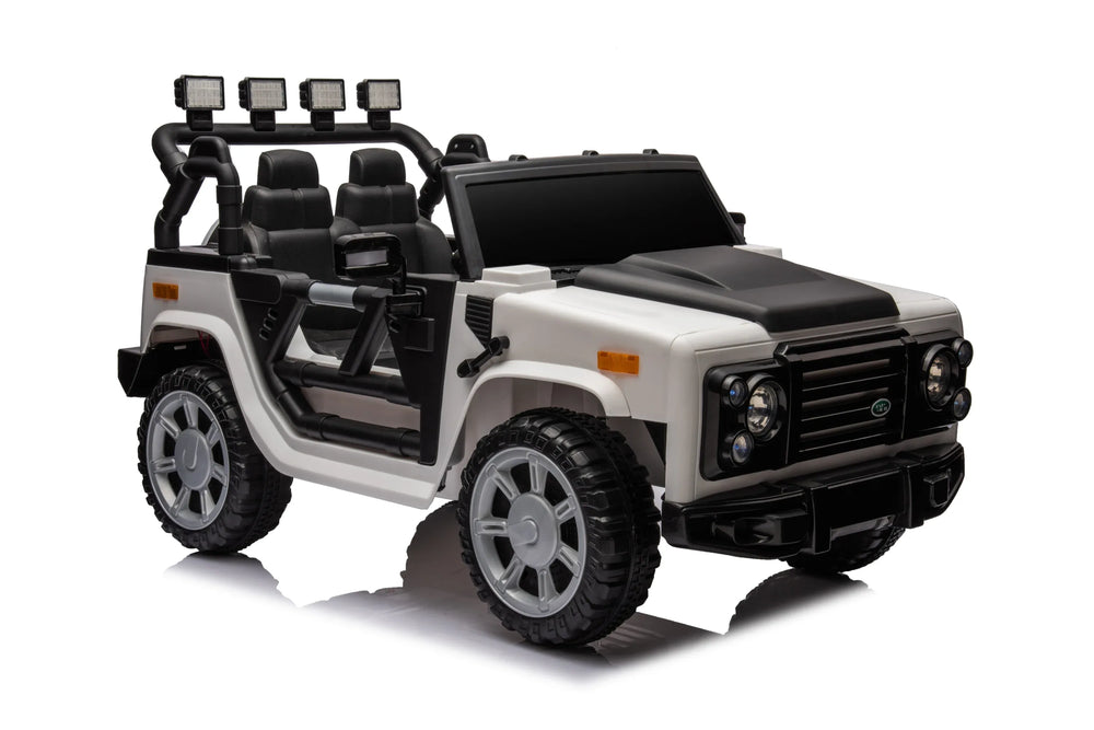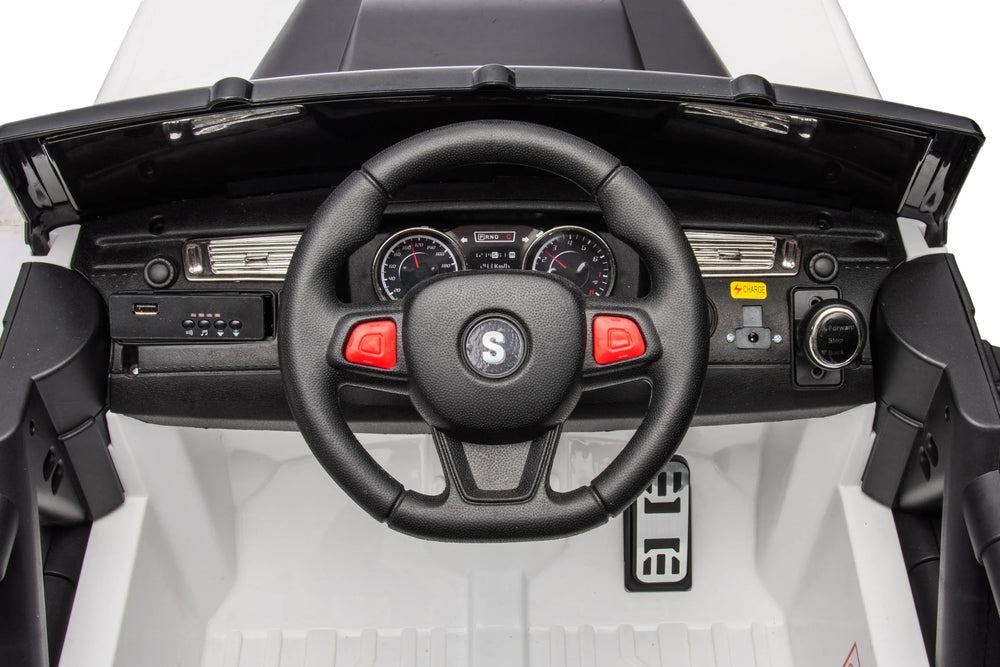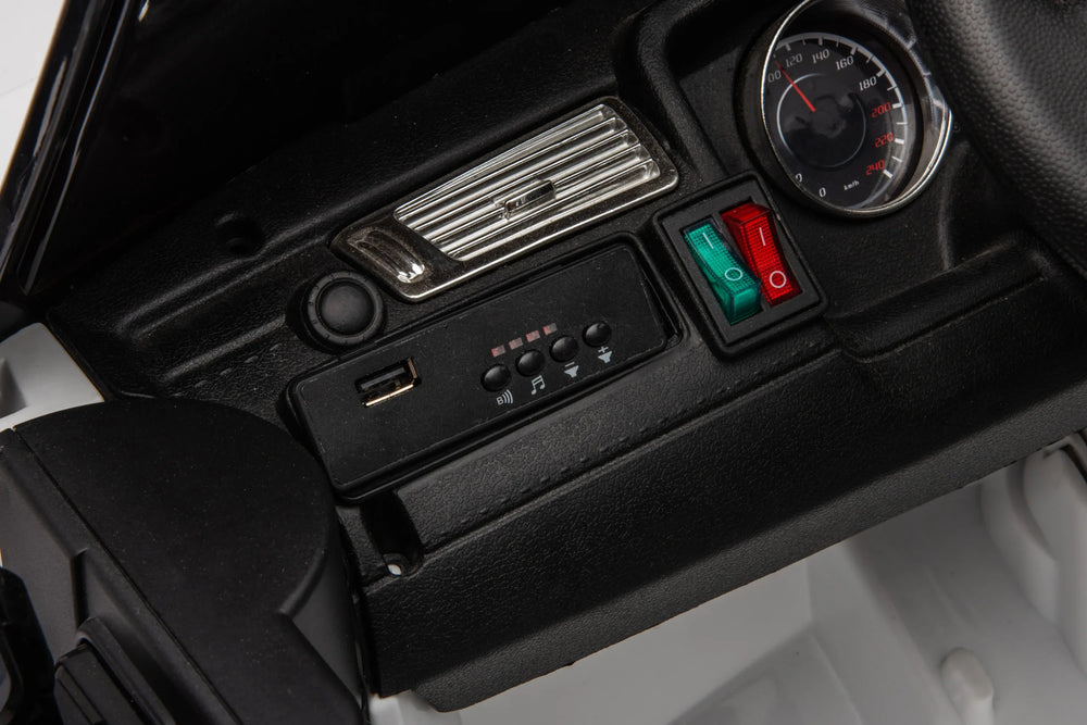 Let your child explore the outdoors with this feature-packed 12V ride-on car designed for kids aged 5 to 8 years. Its robust dual 30W motors provide smooth forward and backward driving with adjustable speeds for a fun and comfortable ride. Crafted with durable iron and plastic and wrapped in a stylish white and black leather seat, this four-wheel drive vehicle features a one-button start, realistic seat belt, and shock-absorbing wheels for enhanced safety and stability on various terrains. Equipped with music, front LED lights, and a power display, it offers engaging entertainment and control with a 2.4G remote. Sized at 47.2 inches long, 27.6 inches wide, and 26.8 inches high, it’s perfectly built for young drivers. Elevate your child’s playtime and excitement with this reliable electric ride-on car today.