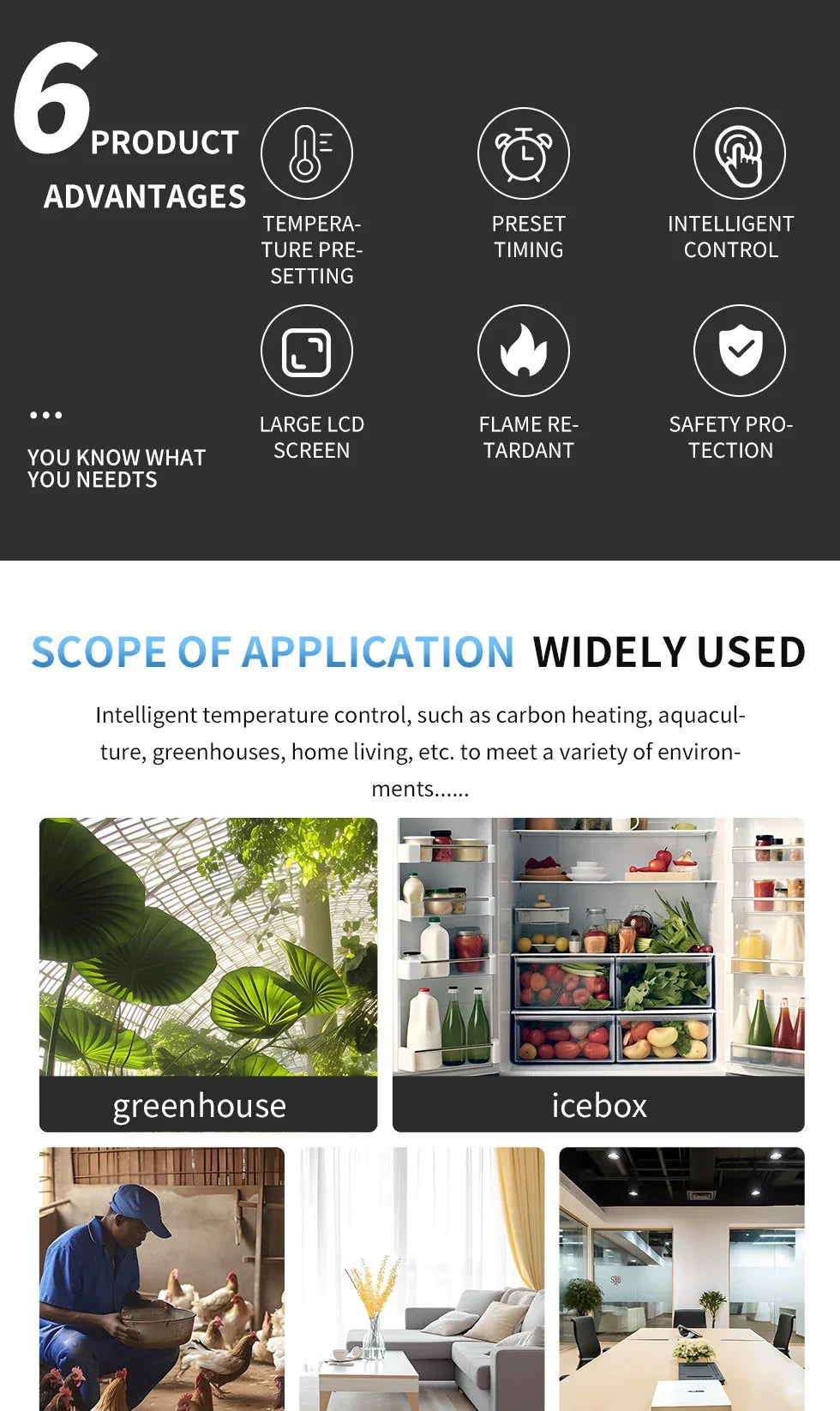 Digital temperature controller with high-precision touch screen and timer switch offers accurate temperature display from -40℃ to 120℃, ±1% accuracy, low power use, and supports heating and cooling control for indoor applications like aquariums and refrigerators.