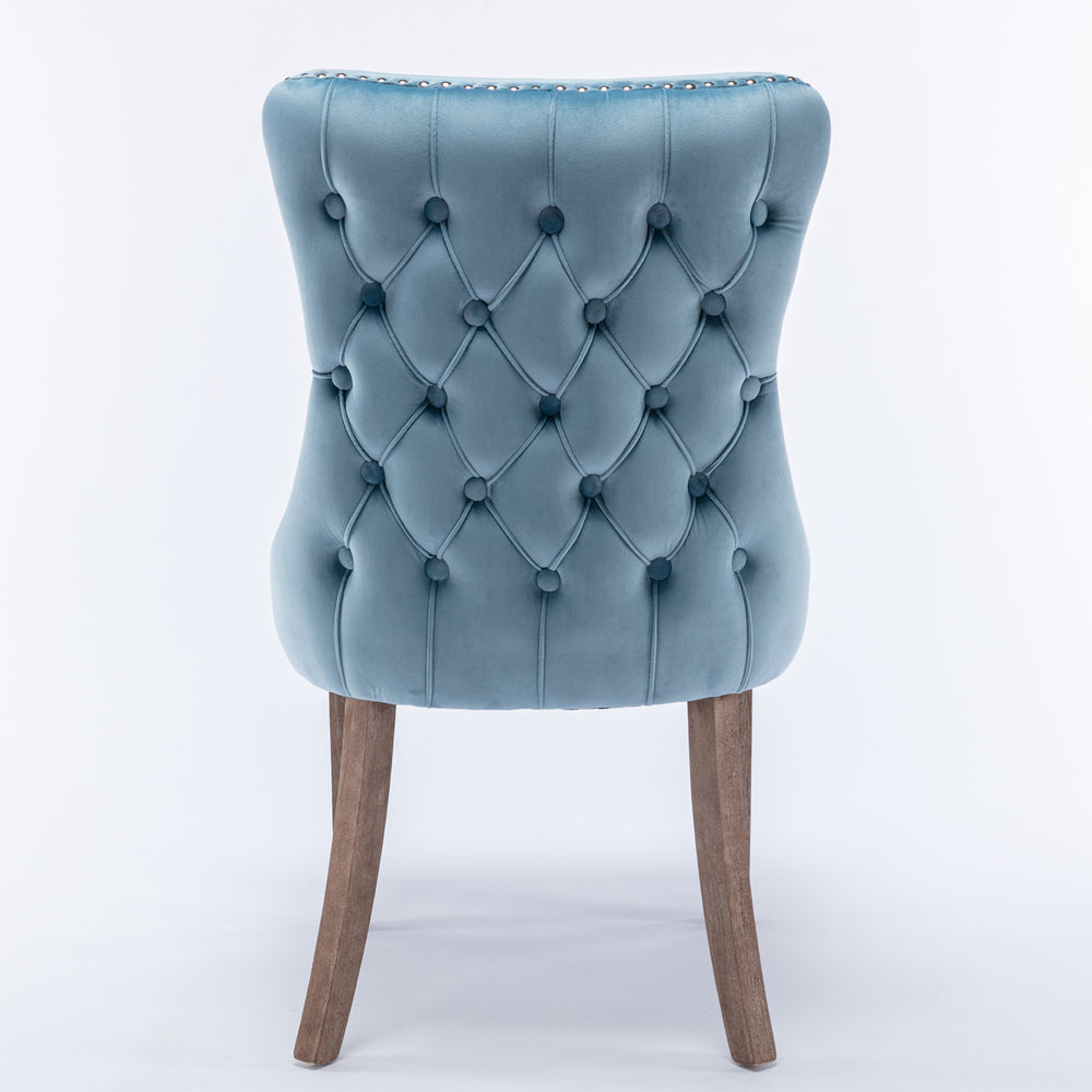 Enhance your dining room with this set of two beautifully crafted wing-back dining chairs, upholstered in soft light blue velvet. Designed with high backs and plush foam cushions featuring steel spring support, these chairs offer exceptional comfort and stylish support during meals and gatherings. The elegant backstitching nailhead trim adds a refined touch, perfectly complementing the American-inspired mid-century design. Constructed with solid rubberwood legs, these chairs provide sturdy durability while maintaining a lightweight 16.5 lbs (7.5 kg) frame for easy handling. Adjustable leg pegs ensure stability on uneven floors, making them ideal for any dining space. Bring sophistication and comfort together to create inviting meals and memorable moments. Elevate your dining experience today.