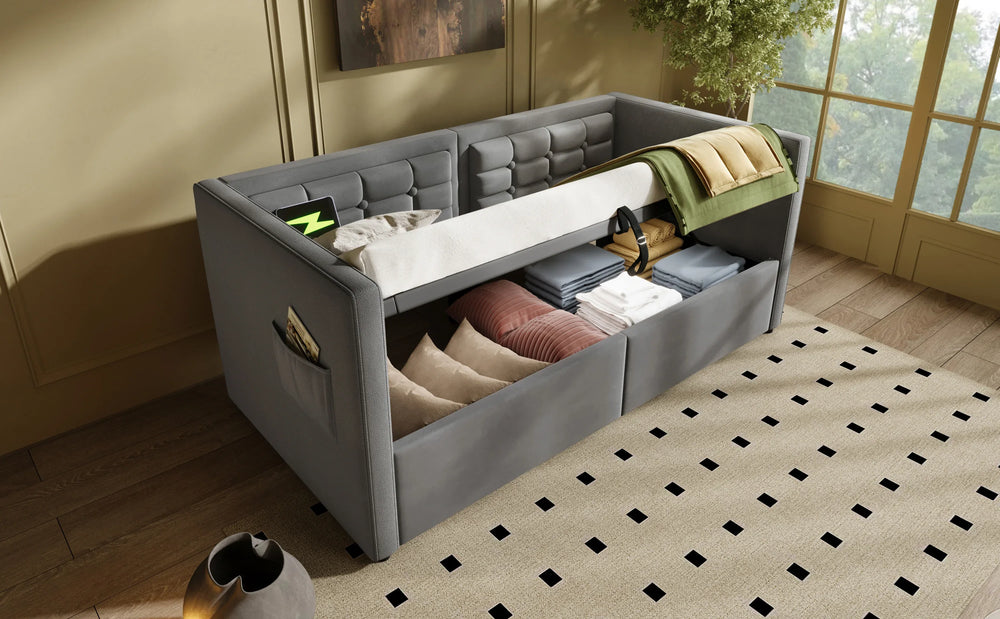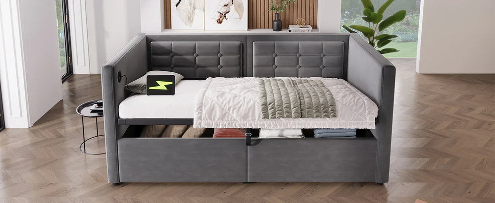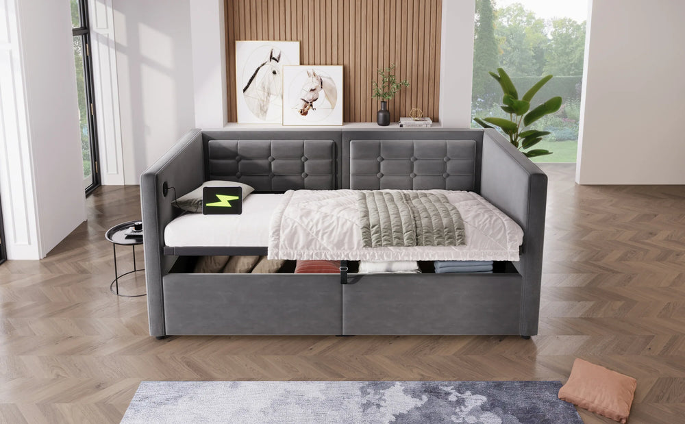 Twin Gray Velvet Upholstered Hydraulic Storage Daybed With USB Charging