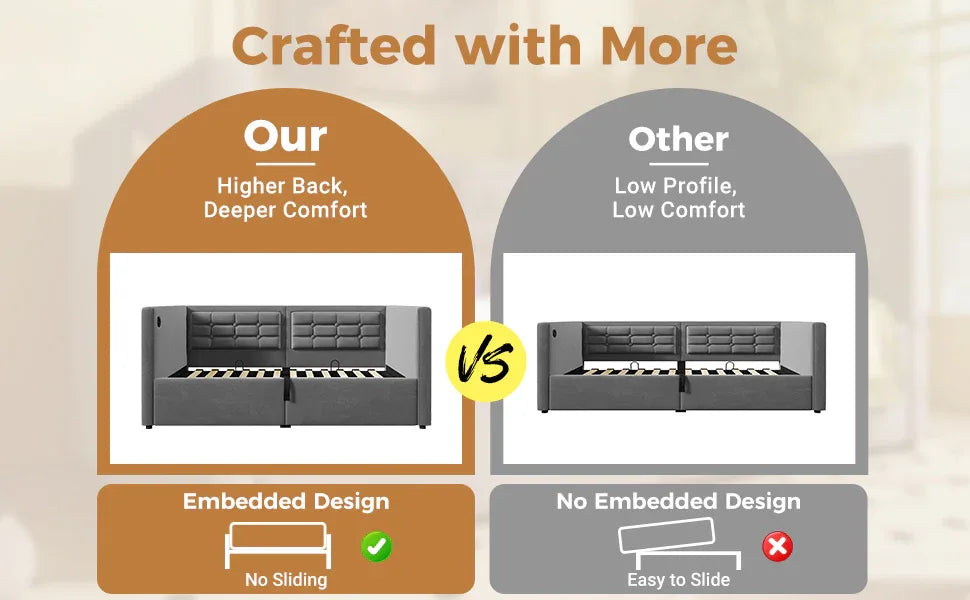 Combine elegance and functionality in your living space with this Gray Velvet Upholstered Twin Daybed. Crafted with soft velvet upholstery and supported by sturdy wooden slats, it offers a comfortable sitting and sleeping solution perfect for small rooms or guest spaces. The hydraulic storage mechanism unlocks ample under-bed space, making it easy to store bedding, books, or daily essentials. Featuring a modern USB and Type-C charging station, you can conveniently power your devices while relaxing or working. Thoughtful design details like backrests on three sides with plush velvet and embossed button accents provide excellent neck and back support. This versatile twin daybed not only enhances your room’s style but also brings practical storage and connectivity right where you need it. Elevate your comfort and organization today.