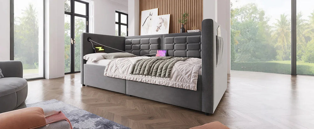 Gray velvet upholstered twin daybed features three-sided backrests for neck and back support, built-in USB and Type-C charging stations, hydraulic storage under the frame, quiet design with sound-proofing, and wooden slats, ideal for compact living spaces and modern convenience.