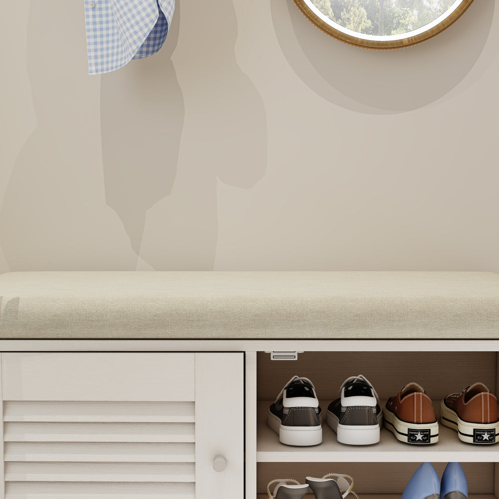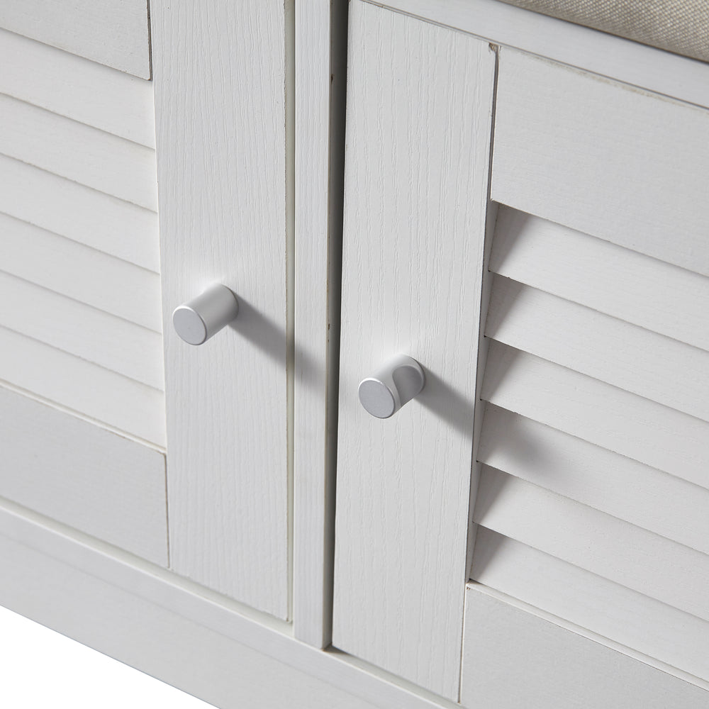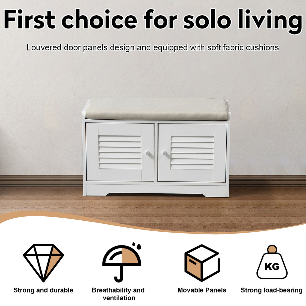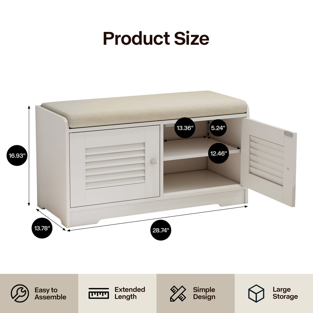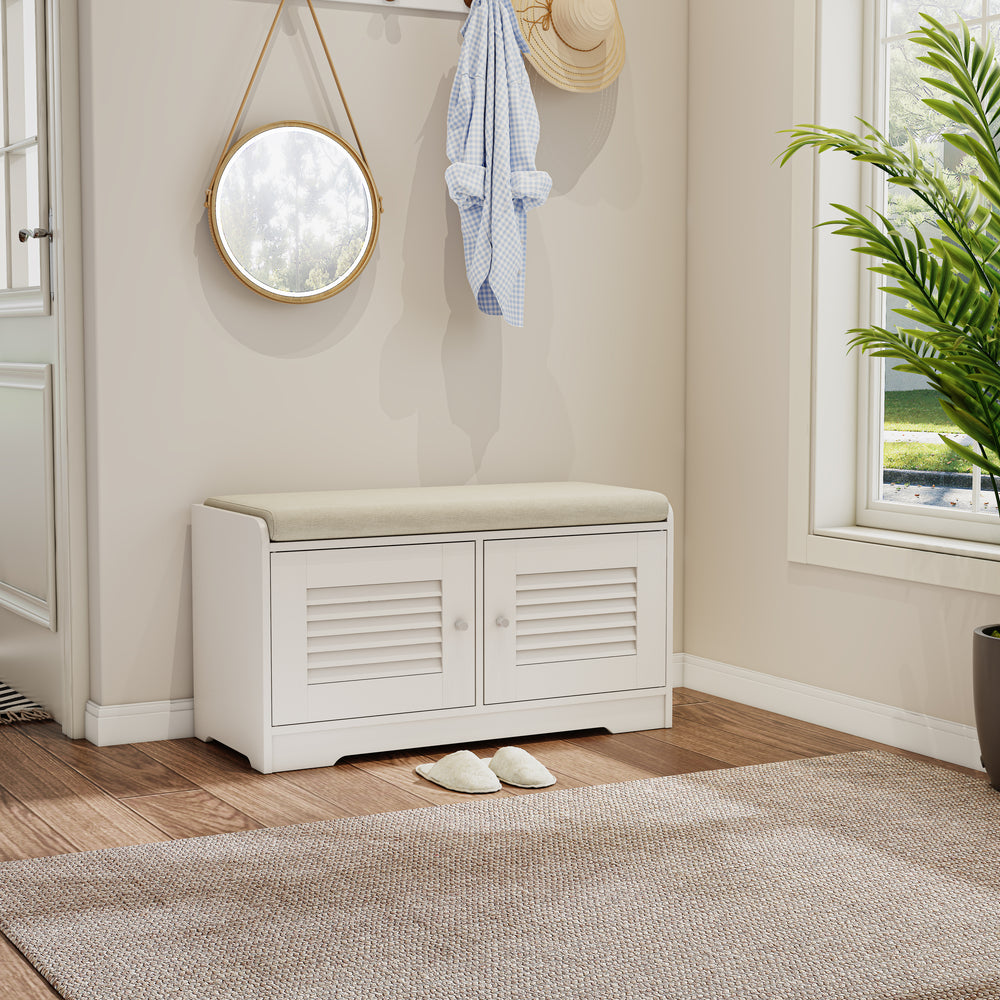 Maximize your space and keep your shoes neatly tucked away with this versatile shoe storage bench. Featuring adjustable panels inside two louvered door cabinets, it accommodates a variety of shoe sizes while promoting breathability to reduce odors. The bench is topped with a detachable high-density cotton sponge cushion, designed at the perfect height for comfortable seating as you put on or remove shoes. Crafted from durable particle board and MDF, this compact entryway bench blends functionality with classic ancient white finish to complement any hallway décor. Easy to assemble in about 30 minutes, it offers reliable stability with a 55-pound panel load capacity. Transform your entryway into an organized, welcoming space—elevate your home today.