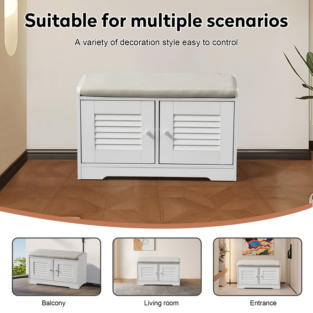 Entryway shoe storage bench features adjustable movable panels to fit various shoe sizes, a breathable louvered door design to reduce odors, and a high-density cotton sponge seat cushion for comfortable seating. Compact and durable for hallway or entryway use.
