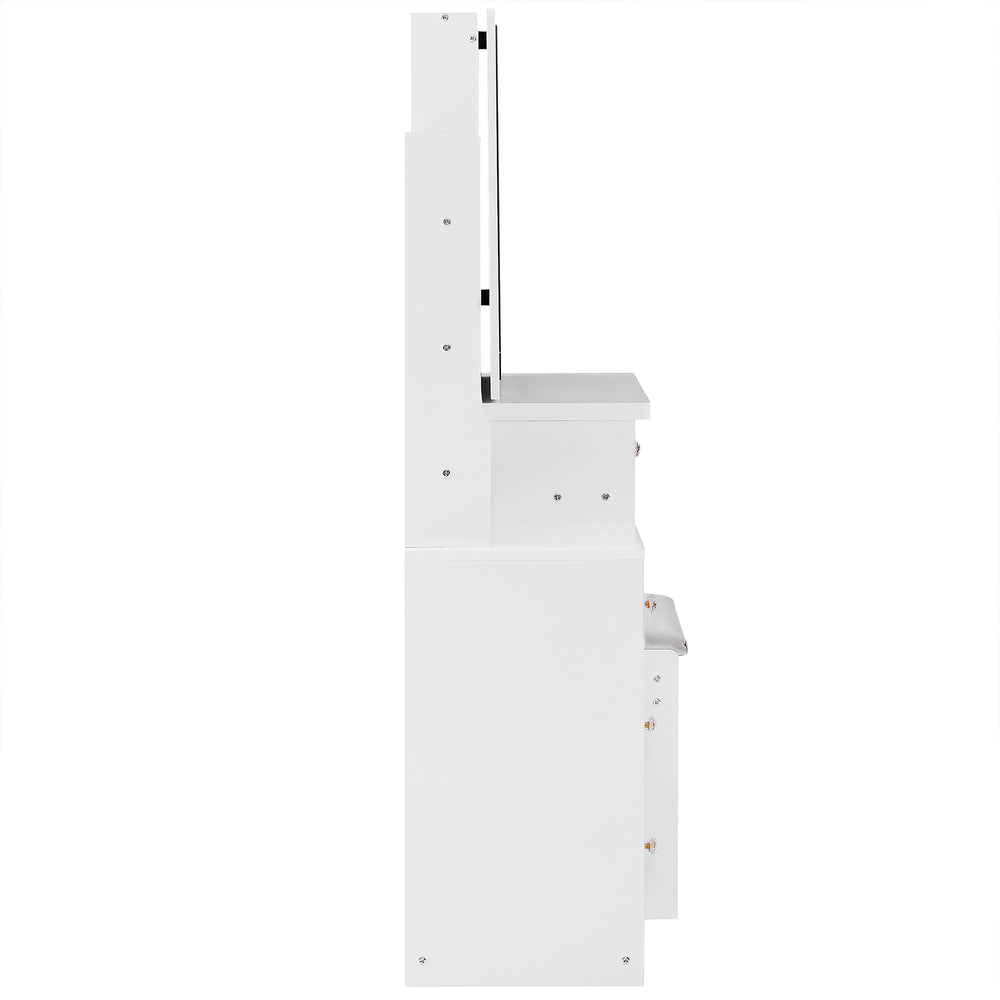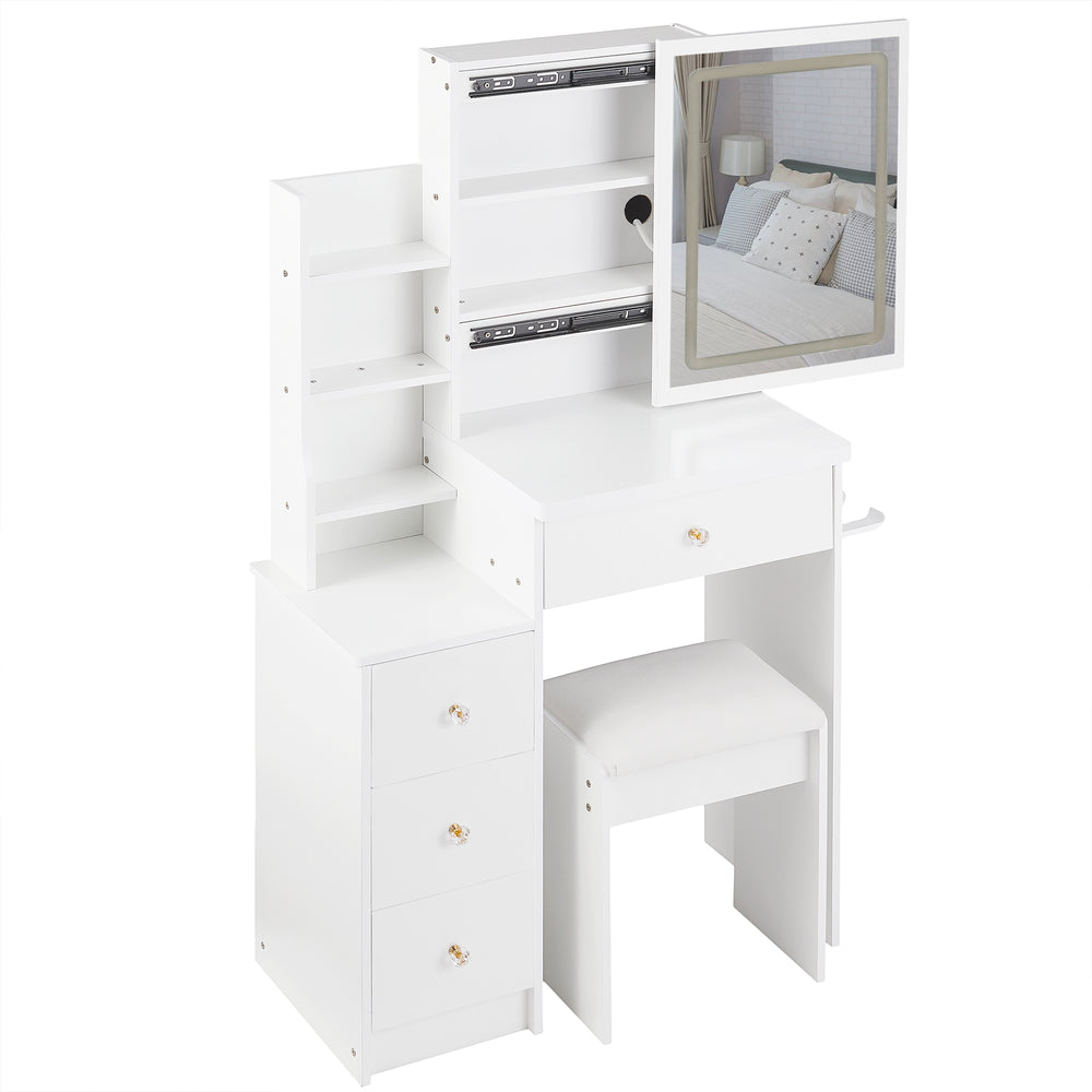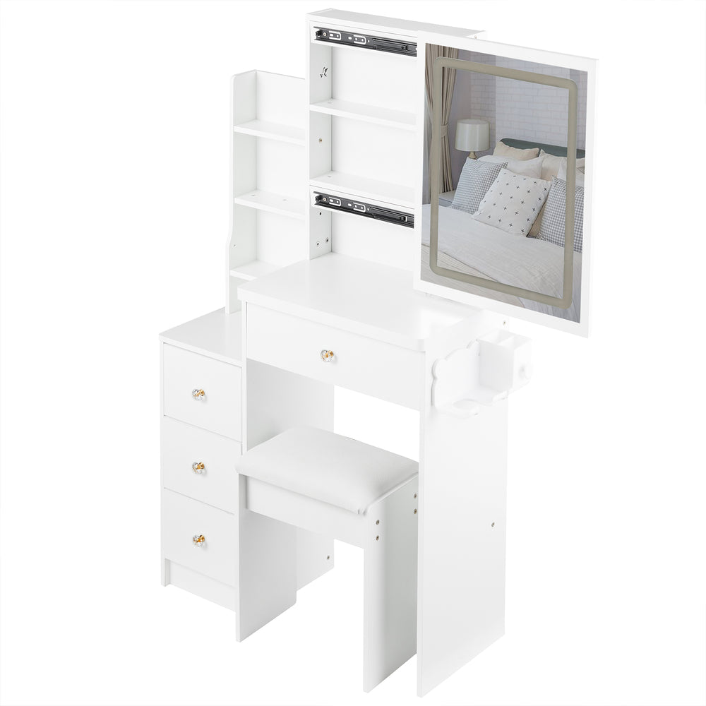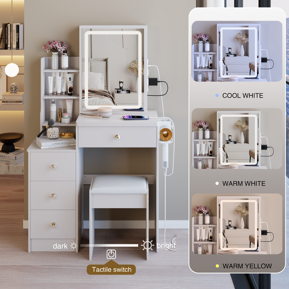Designed specifically for compact bedrooms, this 29.2-inch wide vanity table offers a perfect blend of style and functionality. Crafted from durable MDF with a sleek white finish, it features an extra-large sliding LED mirror with touch controls for tri-color lighting and adjustable brightness, ensuring ideal illumination while you get ready. Equipped with two AC outlets and two USB ports, you can easily charge your devices or power your styling tools simultaneously. The included padded stool provides comfortable seating, making your daily routine effortless and enjoyable. Its smart design and integrated hair dryer bracket help keep your space organized and clutter-free. Elevate your dressing experience and transform your bedroom setup today.
