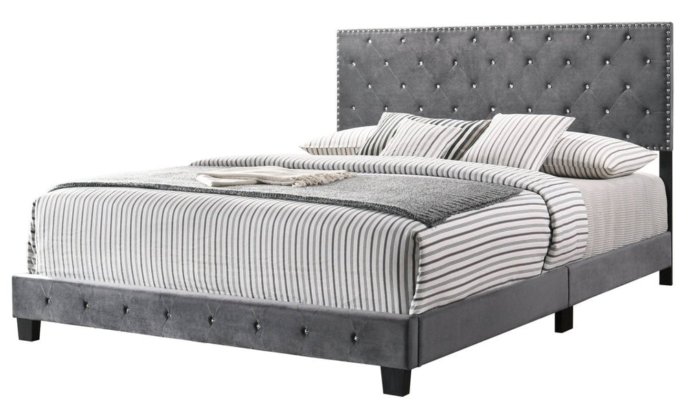 Transitional gray velvet bed frame features foam padding for plush comfort and a sturdy build for durability. Its versatile style complements various decor themes, offers spacious dimensions, and requires assembly for a personalized modern bedroom setup.