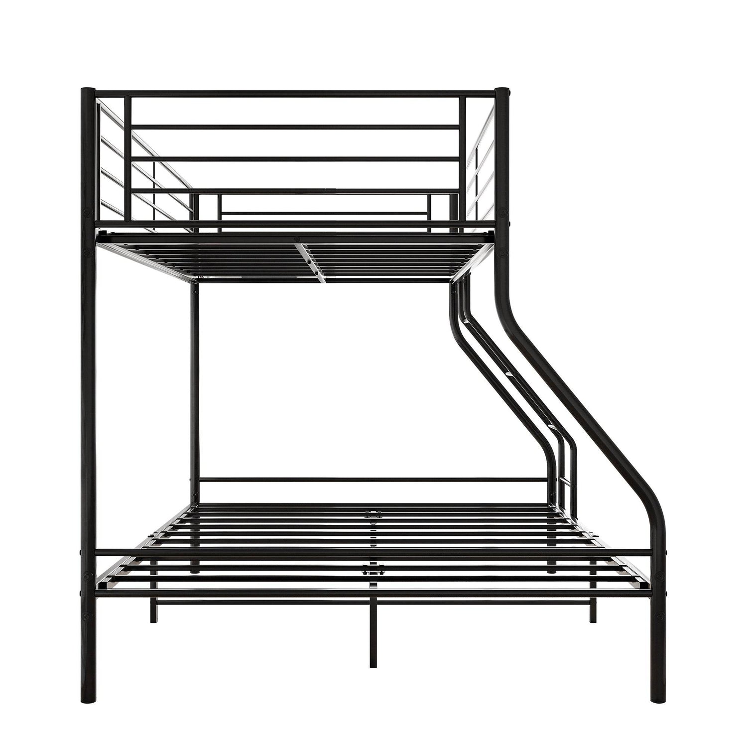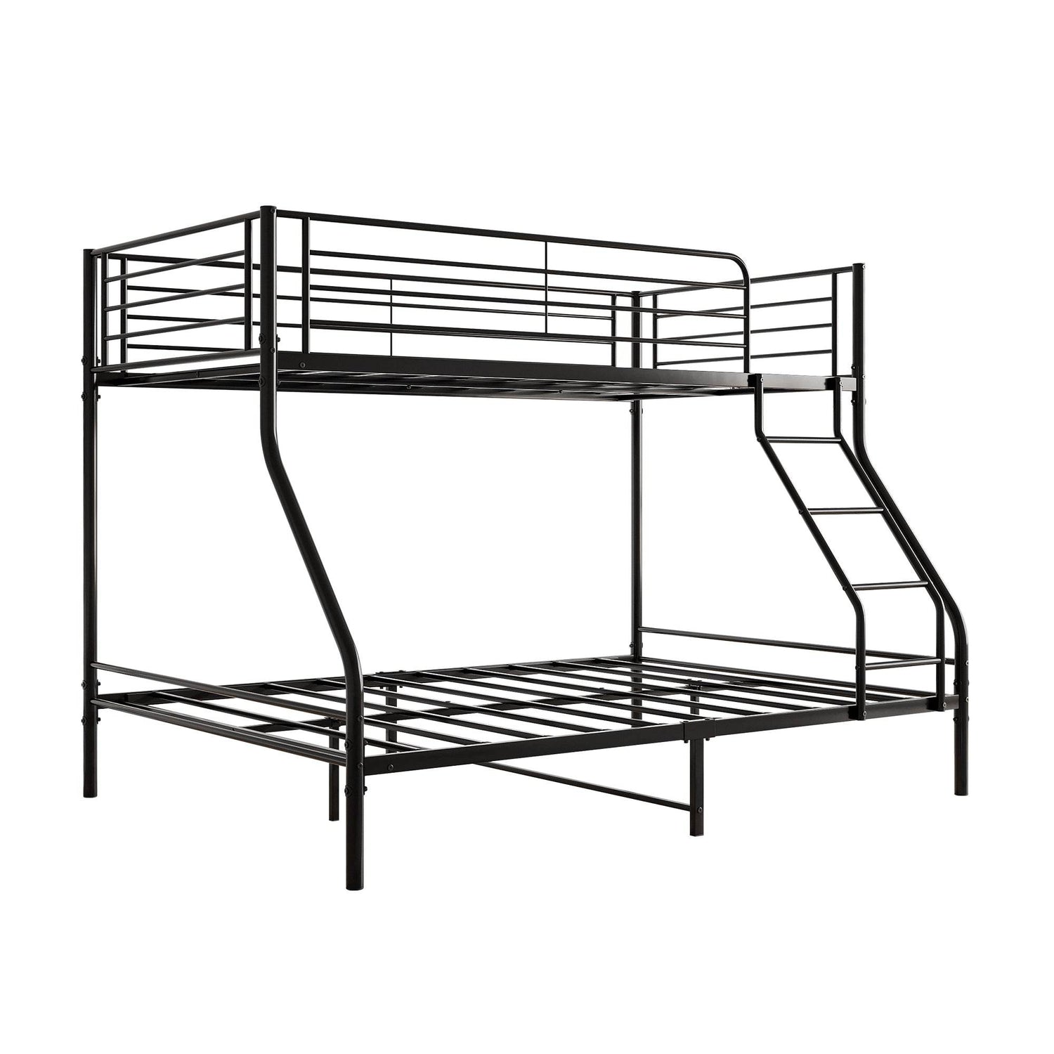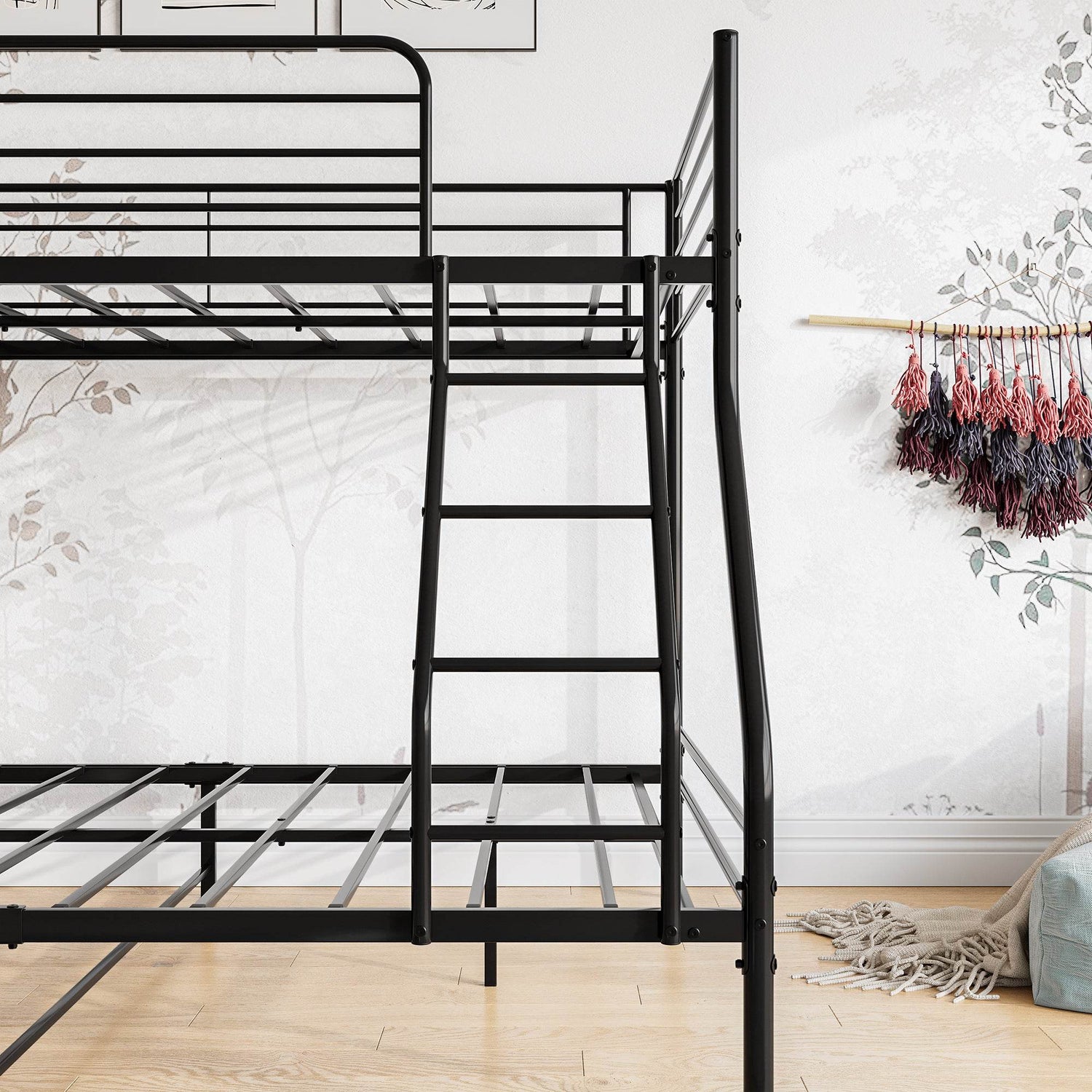 Upgrade your bedroom with this sturdy twin-over-full metal bunk bed designed for durability and safety. Crafted from reinforced metal with a powder-coated black finish, it offers a stable and noise-free sleeping platform perfect for families with multiple children. The enhanced upper-level guardrails and inclined ladder promote safe and easy access to the top bunk, while the integrated metal slats support heavier mattresses without sagging. Measuring approximately 78 inches long, 56 inches wide, and 59 inches high, this bunk bed optimizes space while providing generous clearance underneath for storage. Quick and tool-free assembly lets you set up or relocate it with ease. Whether for shared bedrooms, guest rooms, or dorms, this modern yet timeless design blends style with function to create a reliable and comfortable sleeping solution. Elevate your bedroom organization and comfort today.