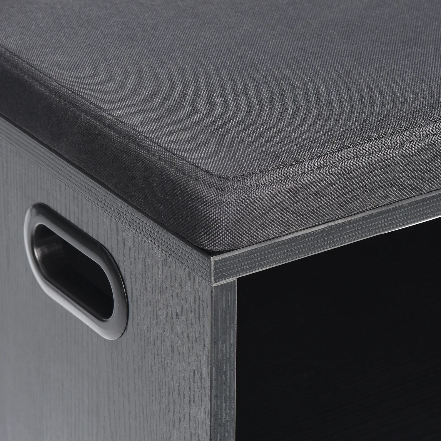 This black wood shoe storage bench features a soft, removable, washable cushion with breathable fabric and Velcro for slip resistance. Adjustable dividers offer customizable shoe storage, supporting up to 440 lbs, with versatile stacking and floor protection for entryway seating and organization.