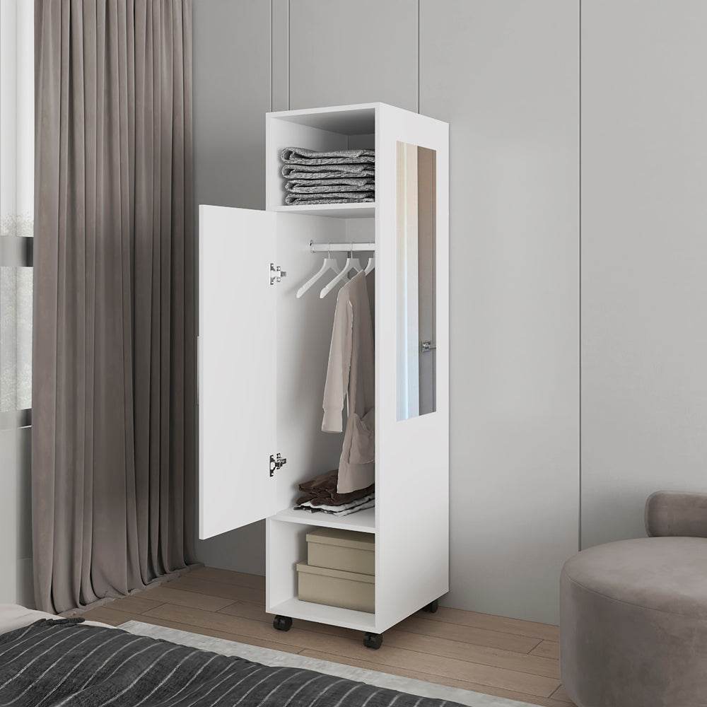 White engineered wood wardrobe features spacious shelves, a cabinet with a clothing rod, and an integrated mirror for convenient storage and organization. Its space-saving design suits bedrooms needing stylish, durable storage for clothes, shoes, and accessories.