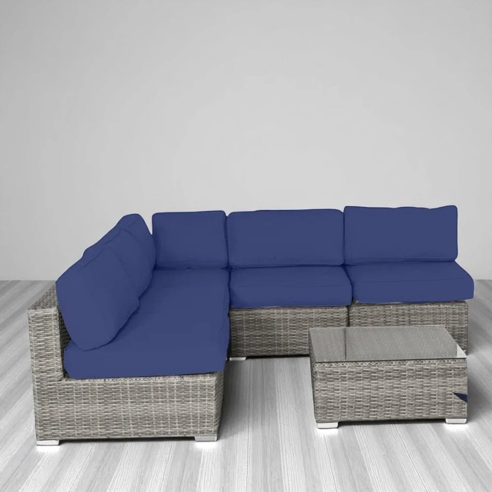 Upgrade your outdoor living space with this 6-piece modern wicker patio furniture set, designed for ultimate relaxation and versatility. Crafted with a rustproof aluminum frame wrapped in handwoven, weather-resistant HDPE wicker, this set offers long-lasting durability and contemporary style in grey mix and navy blue tones. Plush 5-inch (13 cm) thick foam cushions provide superior comfort and support, while the removable, machine-washable covers ensure easy maintenance. The modular, reversible sectional design lets you tailor the layout to fit any garden or patio space, making it perfect for both intimate gatherings and casual lounging. The included tempered glass coffee table adds a sleek, functional surface ideal for drinks and décor. Fully assembled and ready to enjoy right out of the box, this all-weather set is built to withstand sun, rain, and mildew for year-round outdoor enjoyment. Elevate your patio experience today with this elegant and practical sectional seating group.
