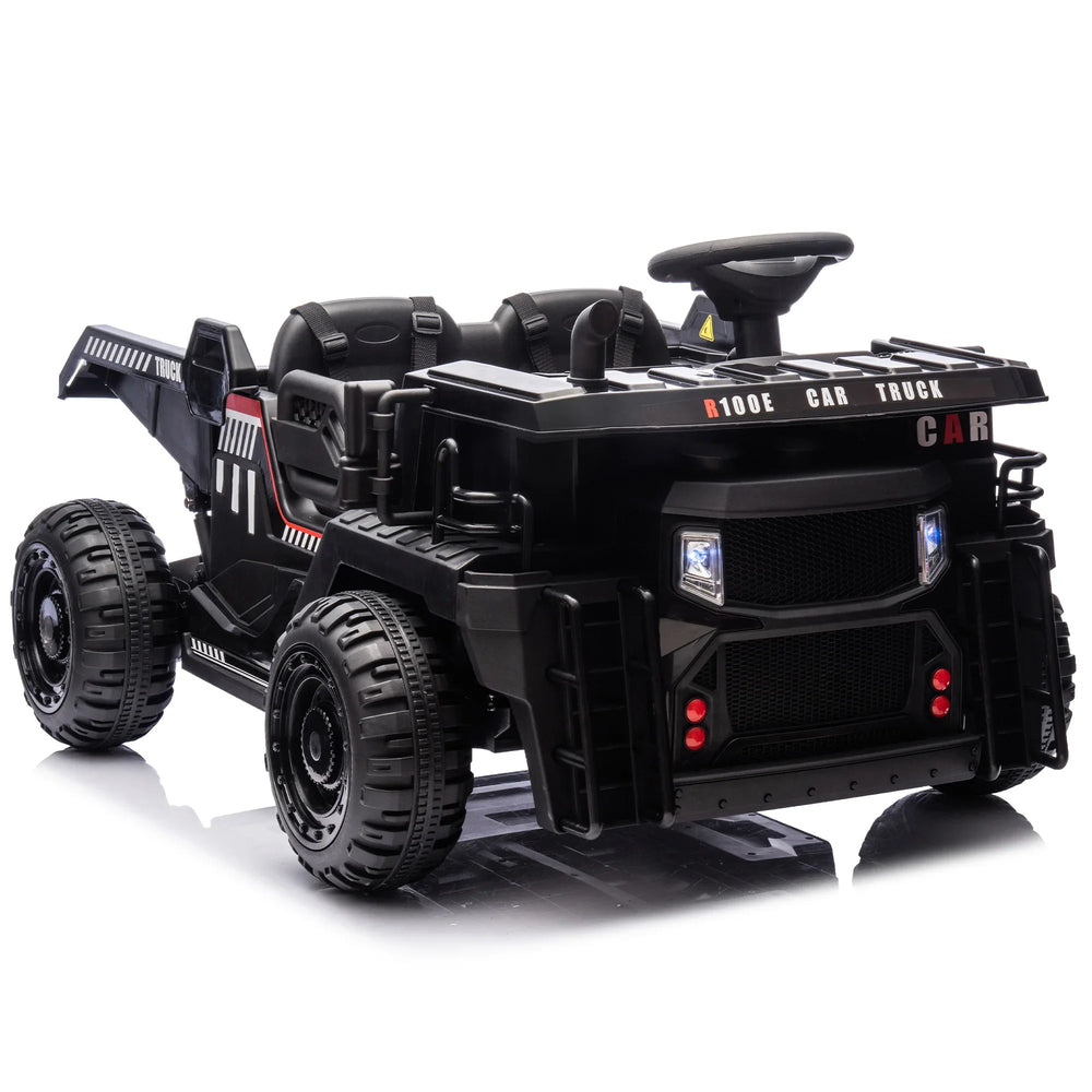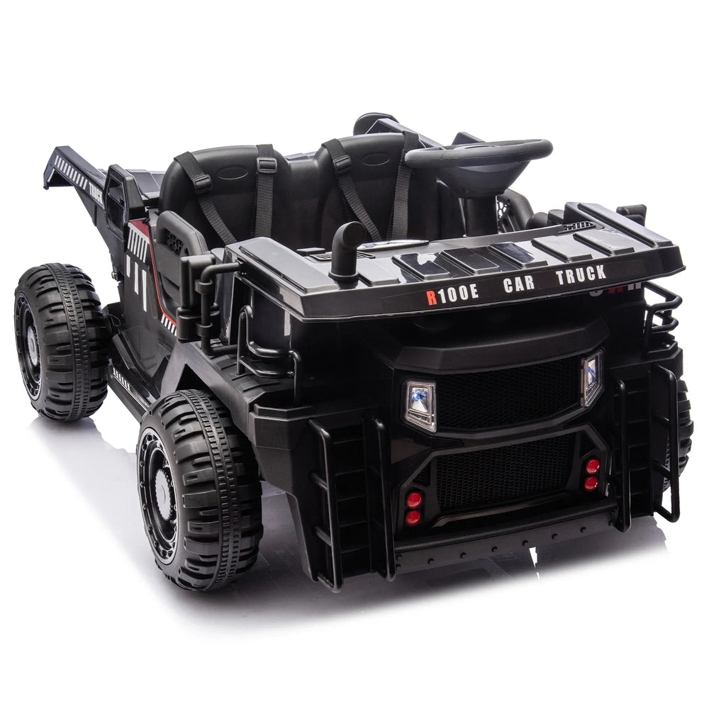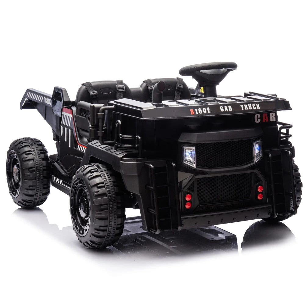 Two-seater kids ride-on electric car features a 400W dual motor, electric rear dump, and USB Bluetooth music for interactive play. Includes 2.4G remote control for parent safety, shock-absorbing rear wheels, LED lights, and easy steering wheel installation.