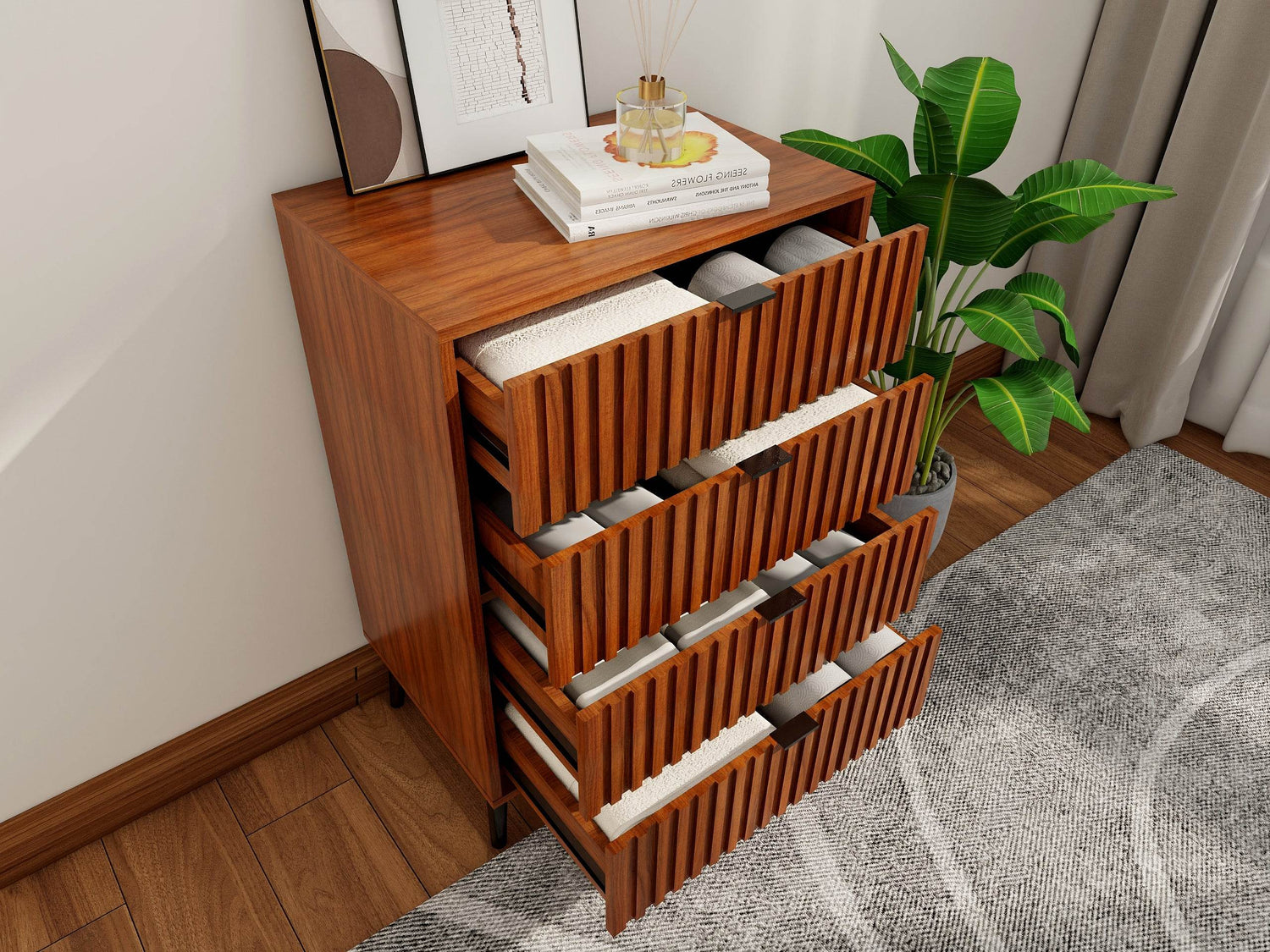 Wooden chest of drawers crafted from durable engineered wood features spacious storage with multiple compartments, an elegant antique brown finish, and a modern vertical slat design, ideal for organizing clothing and accessories in bedrooms or living rooms.