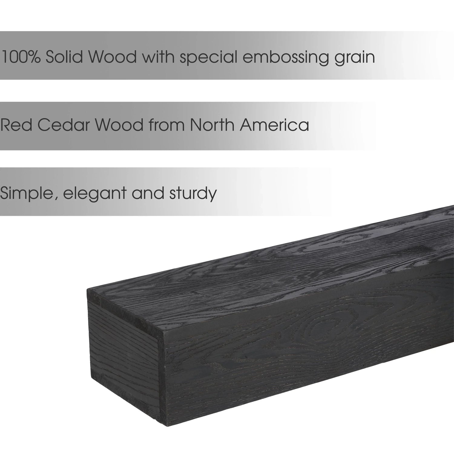 Omega Lifestyles wall-mounted fireplace mantel features solid western red cedar with embossed texture and a water-based finish. Its sturdy 9-inch-thick floating shelf supports up to 50 lbs, adding rustic charm and functional decor to living rooms or kitchens.