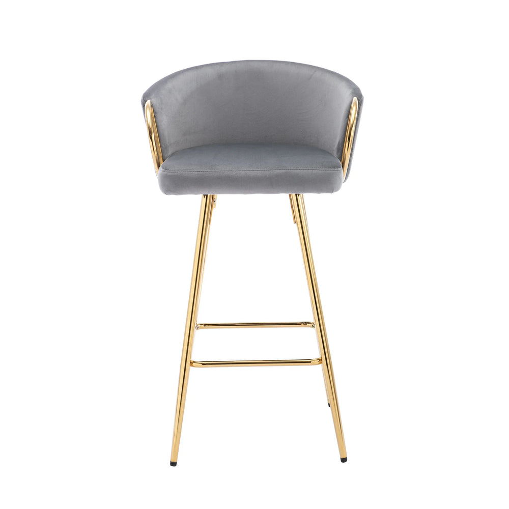 Upgrade your home or bar area with this elegant set of 2 bar stools featuring plush gray velvet upholstery and luxurious foam padding for exceptional comfort. The sleek 30-inch height provides ideal seating for counters or bar tables. Sturdy golden metal legs paired with a chrome footrest and base add a modern, sophisticated touch while ensuring lasting stability. These fabric-covered stools combine style and function, enhancing any space with their contemporary design. Lightweight yet durable, they are easy to move and perfect for entertaining or casual seating. Elevate your seating experience with these chic velvet bar stools today.