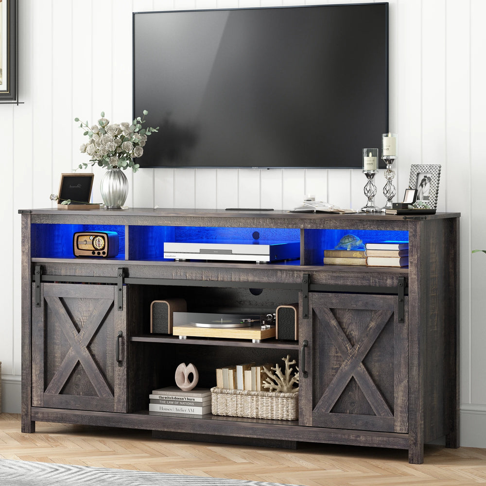 Bring rustic charm and modern functionality to your entertainment space with this 61.5-inch Farmhouse LED TV Stand. Crafted from premium engineered wood with a unique distressed knife-cut grain finish, it blends farmhouse warmth with industrial style. Designed to support TVs up to 70 inches, this versatile stand features adjustable shelving and sliding barn doors for stylish, concealed storage. The built-in RGB LED lights, controllable via Bluetooth app or remote, add vibrant ambiance that can sync with your music, perfect for cozy evenings or lively gatherings. Its sturdy construction holds up to 250 pounds on the countertop, providing reliable support for your TV and accessories. Easy to assemble with included video instructions, this storage cabinet doubles as a sideboard or coffee bar cabinet, elevating any room's decor and organization. Elevate your home entertainment and storage today.