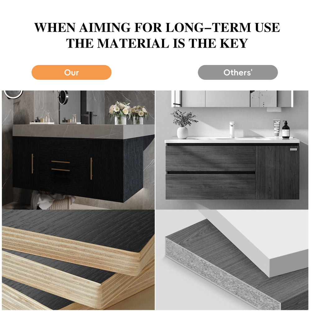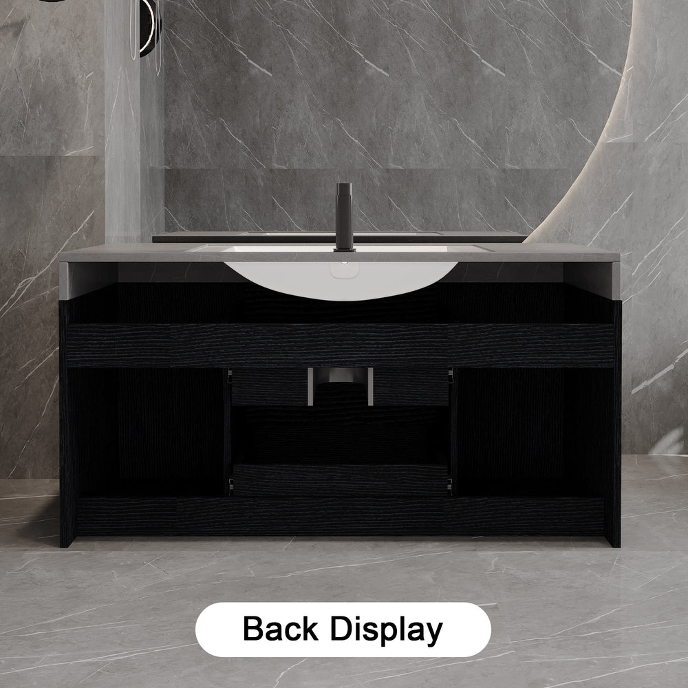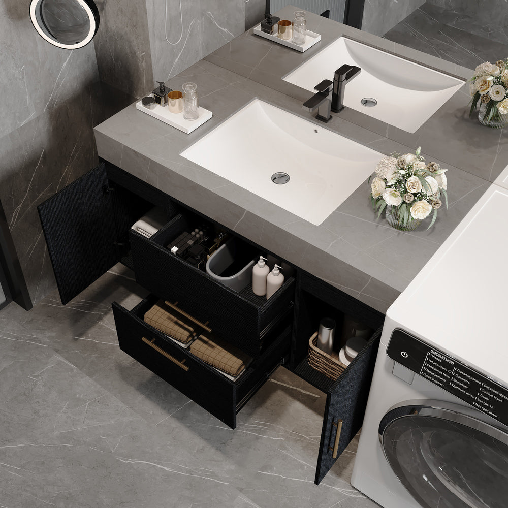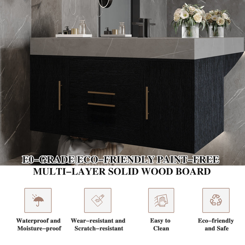 Contemporary floating bathroom vanity features a durable Armani Grey faux marble top, anti-overflow ceramic sink, and multilayer solid wood base with two cabinets and two drawers for organized storage, optimizing bathroom space with sleek black textured finish.