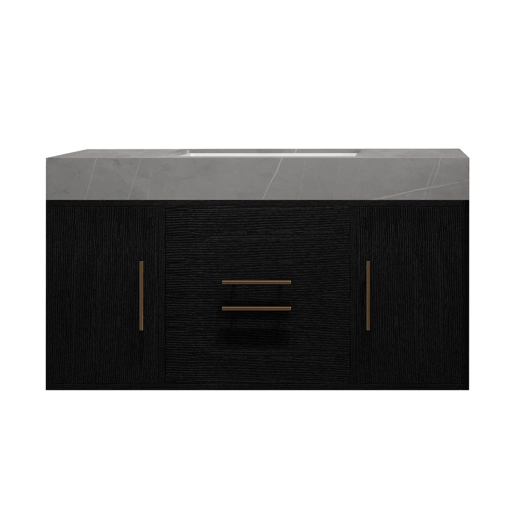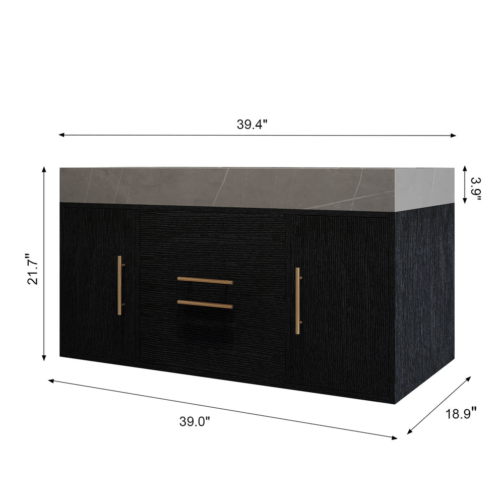 Upgrade your bathroom space with this sleek 39.4-inch single floating vanity designed for modern living. Featuring a luxurious Armani Grey faux marble sintered stone top, this vanity offers a durable, stain-resistant, and easy-to-clean surface perfect for daily use. The smooth ceramic sink includes an anti-overflow function, adding safety and convenience to your routine. Its multilayer solid wood base in a black textured finish brings stability and timeless style to your bathroom while the floating design maximizes floor visibility for a spacious feel. With two large cabinets and two smooth-gliding drawers equipped with metal handles, this vanity provides ample organized storage to keep essentials neatly tucked away. Includes a standard drain assembly for straightforward installation. Faucet and mirror not included. Full assembly is required with all hardware and instructions provided. Enhance your bathroom’s style and functionality today.