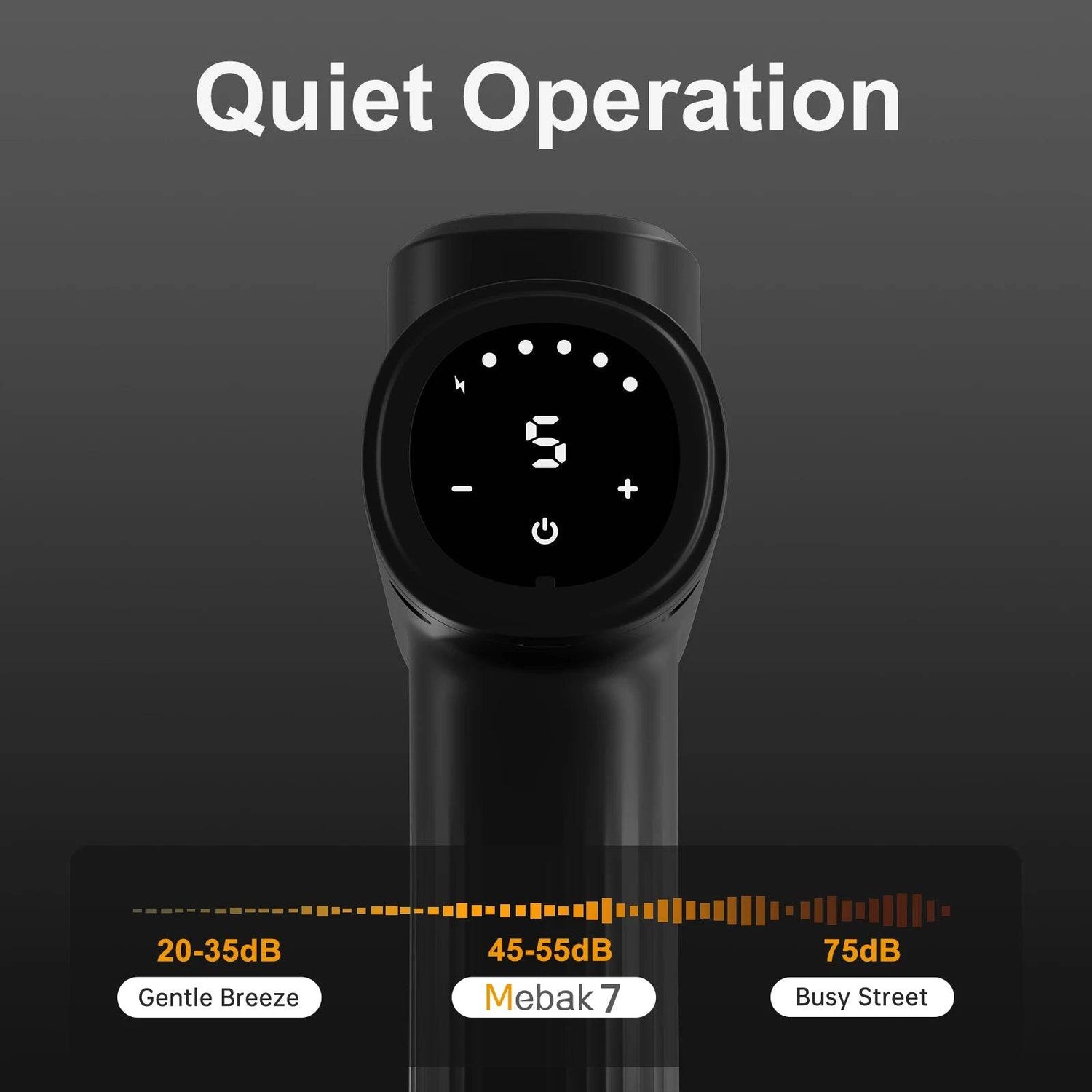 Unlock powerful recovery and relaxation with the Mebak⑦ Massage Gun, designed to target muscle soreness and tension effectively. Featuring five adjustable speed levels ranging from 2000 to 2800 RPM, this lightweight 1.65-pound (750g) device delivers customizable deep tissue massage to alleviate stiffness and improve blood circulation. Equipped with four interchangeable massage heads, it adapts to different muscle groups for precise myofascial release, making it ideal for athletes, office workers, and fitness enthusiasts. Operating quietly between 35-50 dB, you can enjoy therapeutic relief at home, the gym, or the office without disturbance. The USB-C charging port ensures fast, convenient power-up for on-the-go use. Relieve neck, back, and calf discomfort caused by prolonged sitting or intense workouts. Elevate your self-care routine and accelerate recovery—upgrade to Mebak⑦ today.