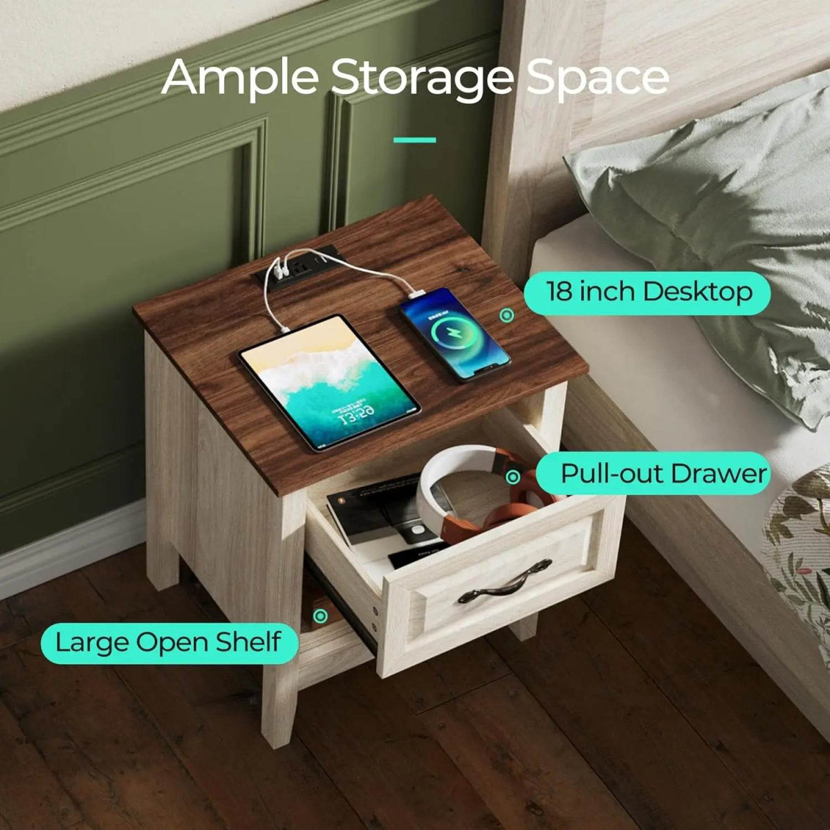 Upgrade your bedside experience with this stylish 18.9" farmhouse wood night stand, designed for both convenience and classic charm. Crafted from sturdy engineered wood with a scratch- and water-resistant finish, it offers lasting durability while complementing a variety of décor styles. The spacious top surface gives you plenty of room to display lamps, books, or decorative accents. Stay connected effortlessly with the built-in Type-C charging station, USB port, and two power outlets—perfect for keeping your devices powered overnight without clutter. An integrated drawer and open storage shelf provide ample space to organize essentials and keep your bedroom tidy. Smooth-rolling casters make repositioning quick and easy, adding versatility for use beside a sofa or in an office nook. Make your daily routine more organized and efficient—elevate your relaxation today.