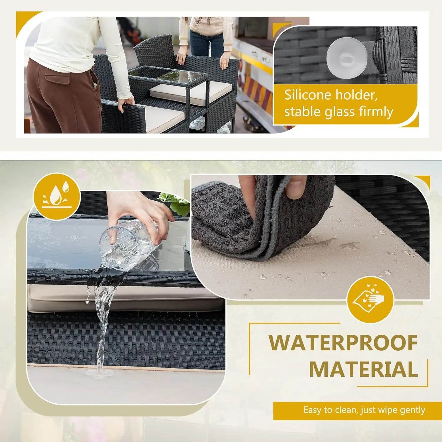 Enhance your outdoor living space with this beautifully crafted patio loveseat, designed to offer both comfort and convenience. Hand-woven from premium all-weather PE rattan, this 2-seat bench combines durability with breathability, ensuring it stays cool and welcoming even in the summer heat. The rust-proof steel frame provides sturdy support with a 300 lb weight capacity, making it perfect for your balcony, lawn, or backyard. Ergonomically designed, the wide seat, curved armrests, and supportive backrest promote ultimate relaxation. The integrated tempered glass tabletop and hidden storage compartment offer practical space for drinks, snacks, or books, helping you stay organized while enjoying the outdoors. Soft, water-resistant cushions with removable covers add plush comfort and easy maintenance. Quick assembly means you’ll be relaxing in no time. Upgrade your outdoor retreat today with this versatile loveseat that blends style, function, and lasting quality.