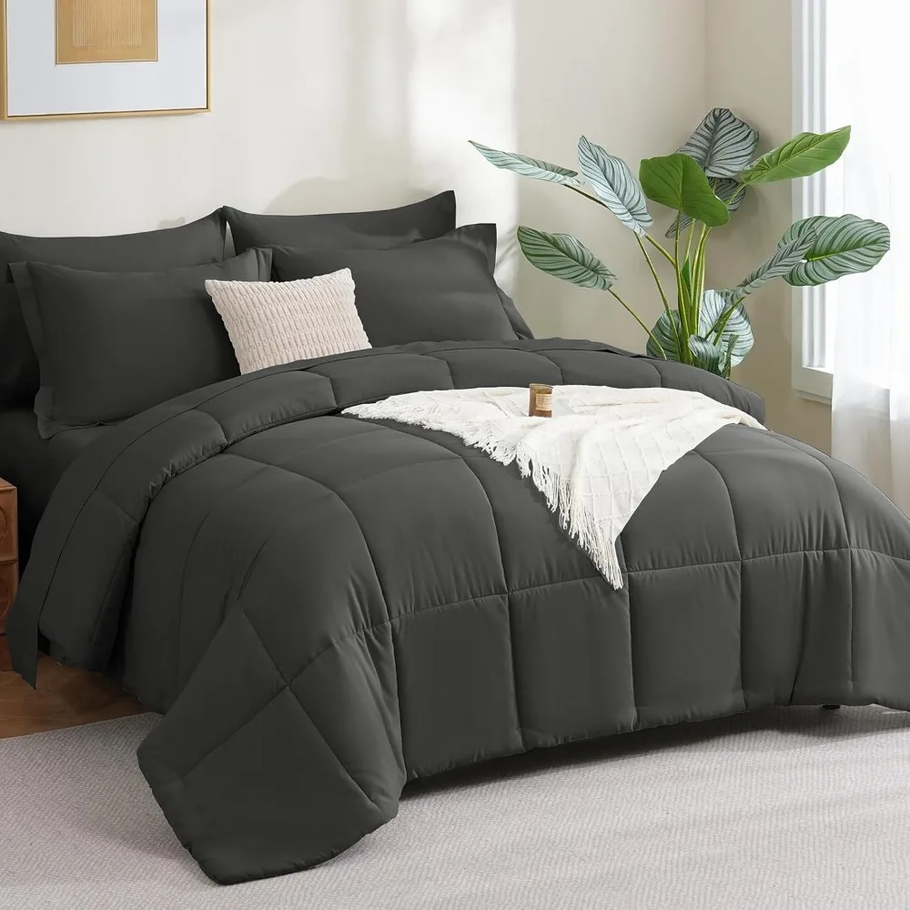 Queen Bed in a Bag 7 Pieces Bed in a Bag Dark Gray Queen Comforter Set Bedding Bed Set for All Season with Comforter, Flat Shee