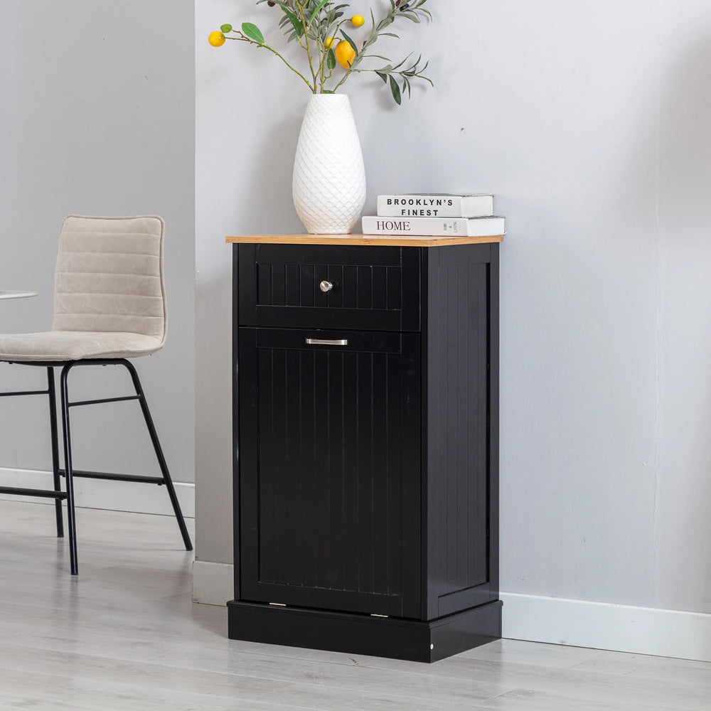 Keep your kitchen and laundry area tidy and stylish with this freestanding tilt-out trash cabinet designed for convenience and durability. Crafted from moisture-resistant MDF and topped with a durable bamboo surface, it offers extra counter space that supports up to 66 lbs. The hidden trash compartment is perfect for concealing odor and keeping pets out, promoting a clean and organized environment. This multifunctional cabinet also doubles as a laundry hamper, recycle bin, or dog food storage, making it an ideal solution for busy households. Easy to assemble and available in Black, White, and Grey, it’s a versatile, space-saving addition to any room. Elevate your home organization today with this sleek and practical trash cabinet.