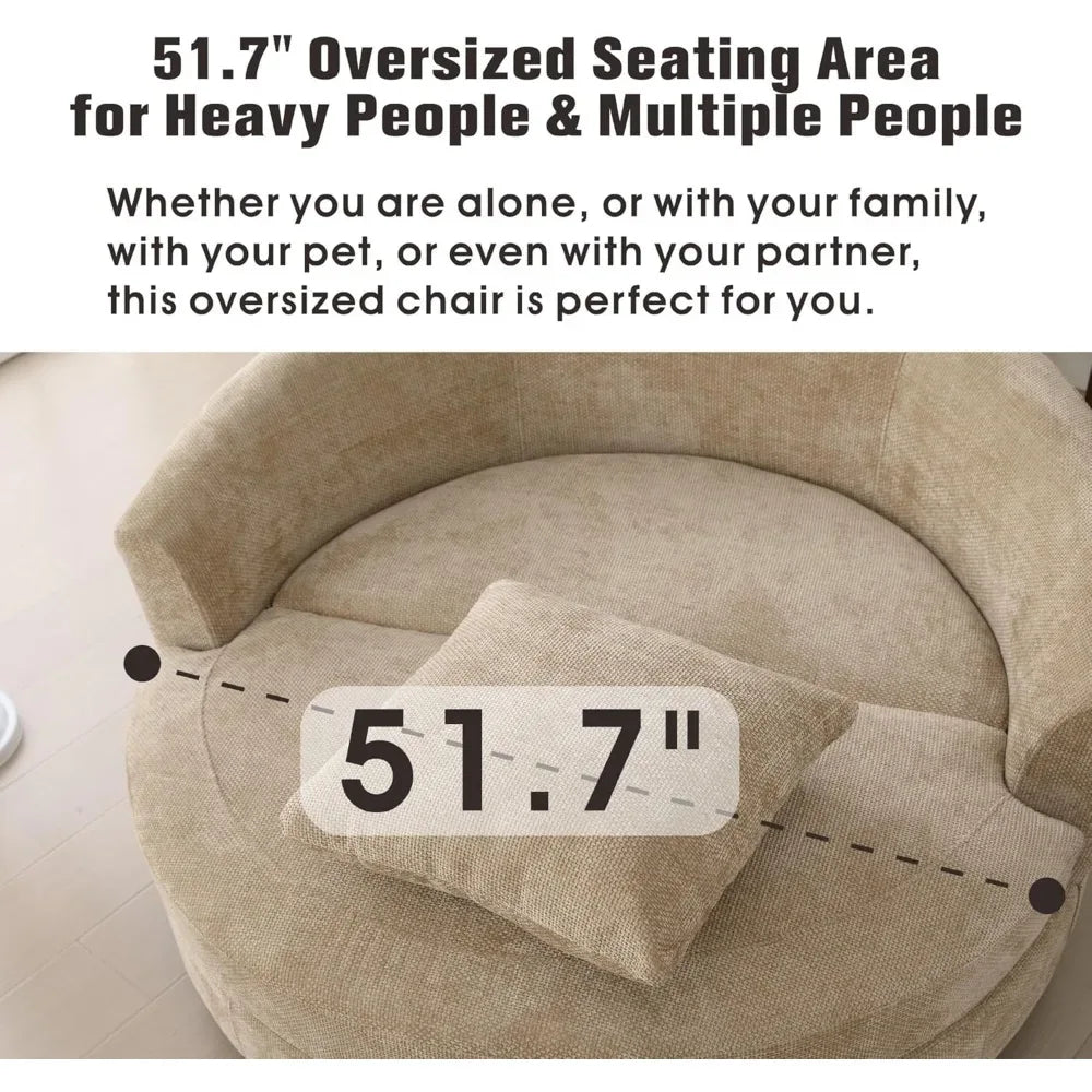 RBXC oversized round barrel chair features ergonomic chenille fabric upholstery, a spacious 57-inch seating area supporting up to 450 pounds, two silent wheels for easy mobility, and a multifunctional storage ottoman, ideal for living rooms, offices, and relaxing with family or pets.