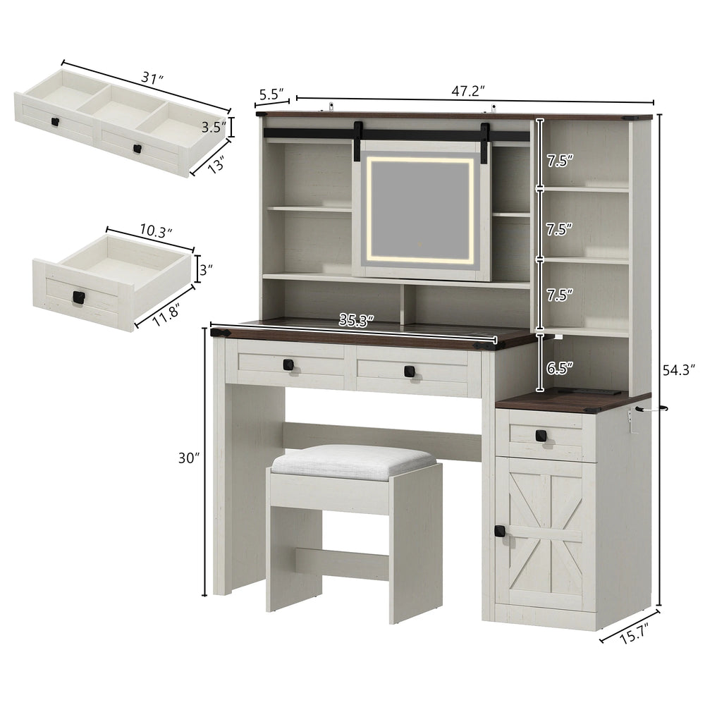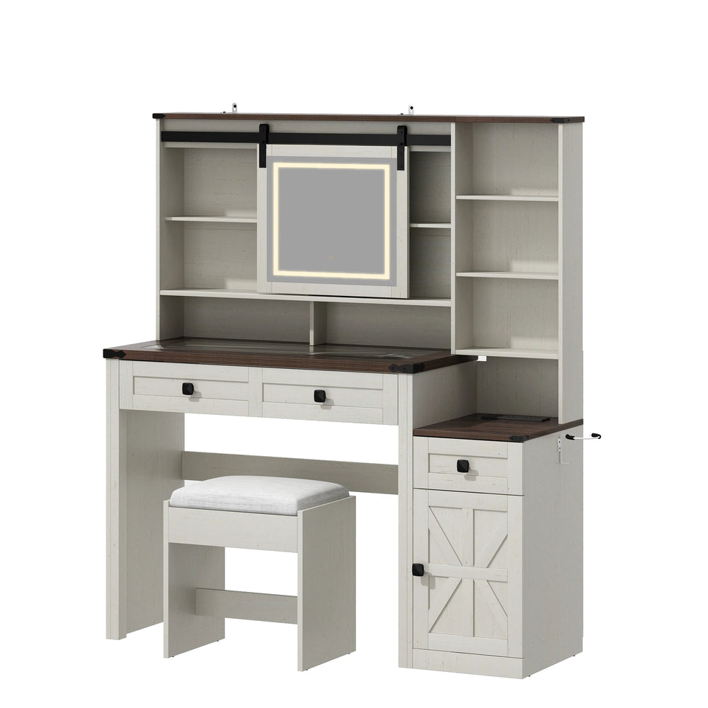 Bring style and functionality to your bedroom with this elegant farmhouse makeup vanity desk. Crafted from engineered wood, glass, and metal, it combines rustic charm with modern convenience. The sliding HD mirror is framed by adjustable LED lights in cool white, warm white, and natural tones, providing perfect illumination for makeup and skincare. Designed for comfort, it includes an upholstered stool and a built-in charging station with multiple outlets and USB ports to keep your devices powered and organized. With spacious storage options—two drawers, adjustable shelves, a cabinet, and a 10-grid organizer beneath a tempered glass desktop—you'll have ample space to neatly store all your beauty essentials. Its sturdy barn-door design with slow-closing hinges adds lasting durability and vintage flair to any bedroom. Transform your grooming space and enjoy practical elegance every day. Elevate your relaxation today.