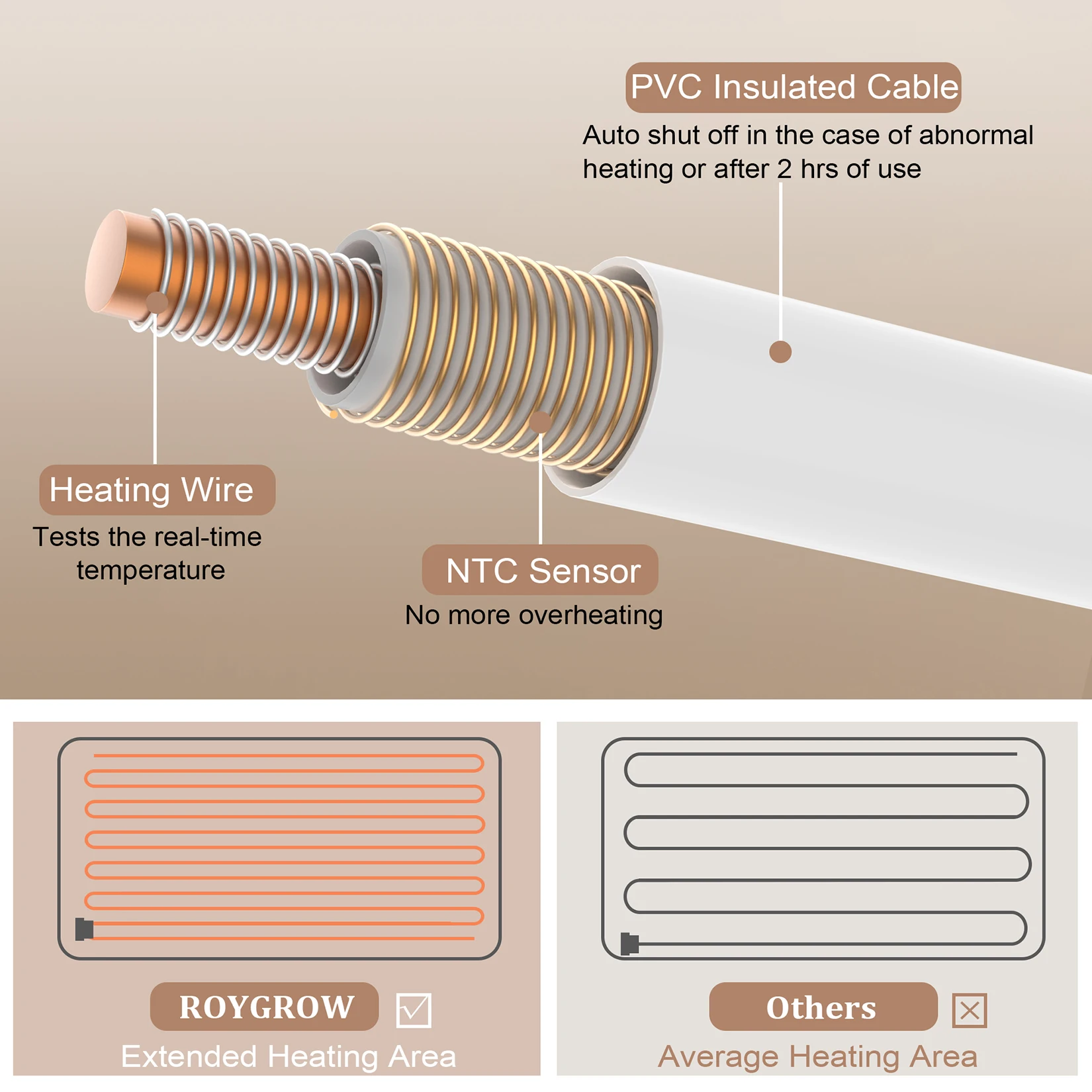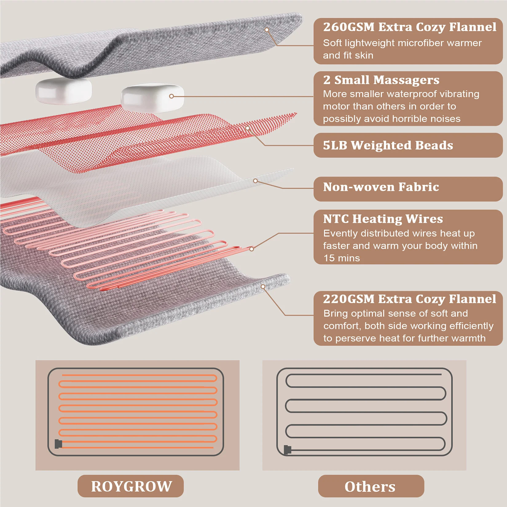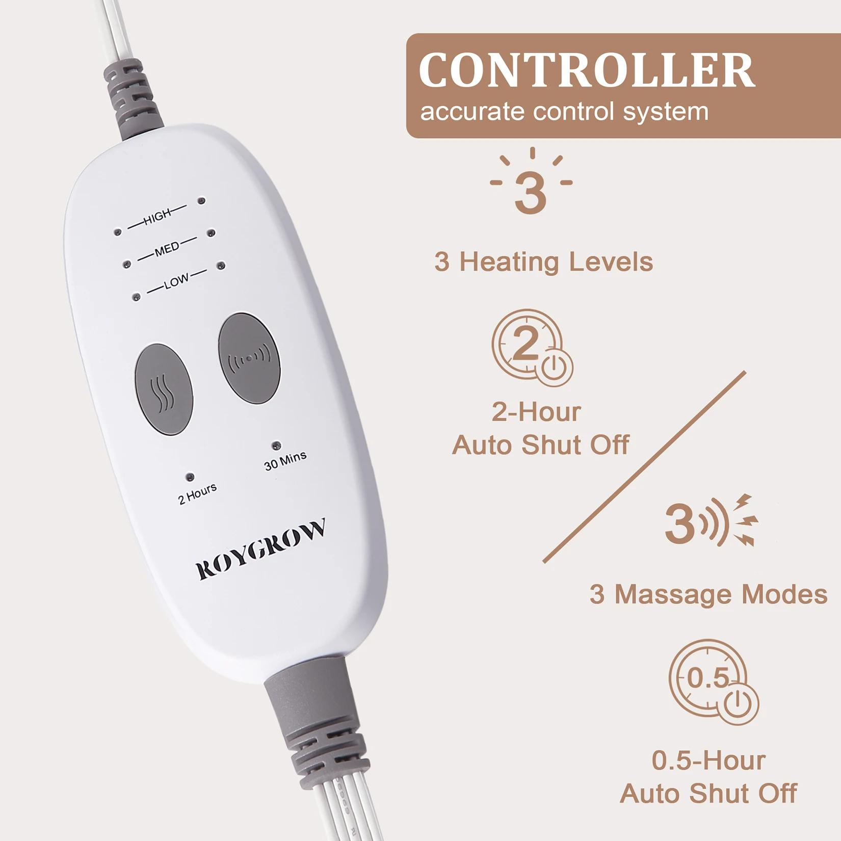 【Fast Heating】ROYGROW weighted heating pad with massager employ 3 heating settings with auto off after 2 hours and fast heating technology allows you to feel heat quickly within 15 minute. The 9 Meter lengthened heating wire is 2 meters longer than others, with extended heating area and faster heating rate. The maximum temperature 145°F is 20°F higher than regular heating pad, making it ideal for back neck shoulder pain relief.