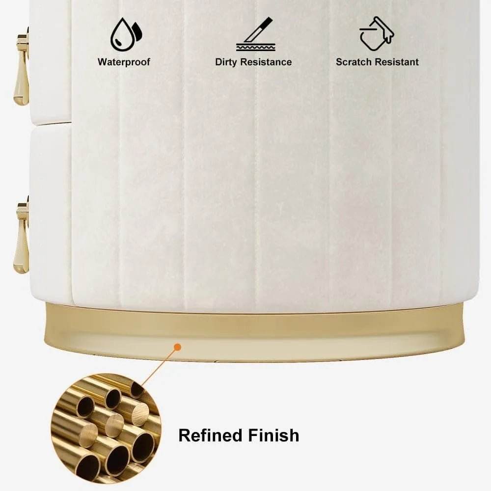 White velvet nightstand features a minimalist round design with a durable stone top and three spacious drawers for ample storage. Crafted from high-quality metal and stone with velvet upholstery, it enhances bedroom organization while adding modern style and lasting stability.